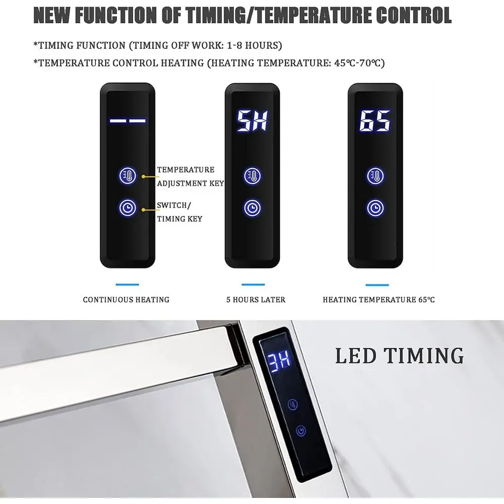 Heated Towel Rack with Timer: This Towel Warmer Has a Built-In Timer with 1H to 8H. You Can Press and Hold the Switch for a Few Seconds to Easily Turn It On. after You Turn on the Heated Towel Rack, It Will Warm up Within 5 Minutes and Reach Optimum Temperature 113-122°F / 45-50°C Within 10-20 Minutes