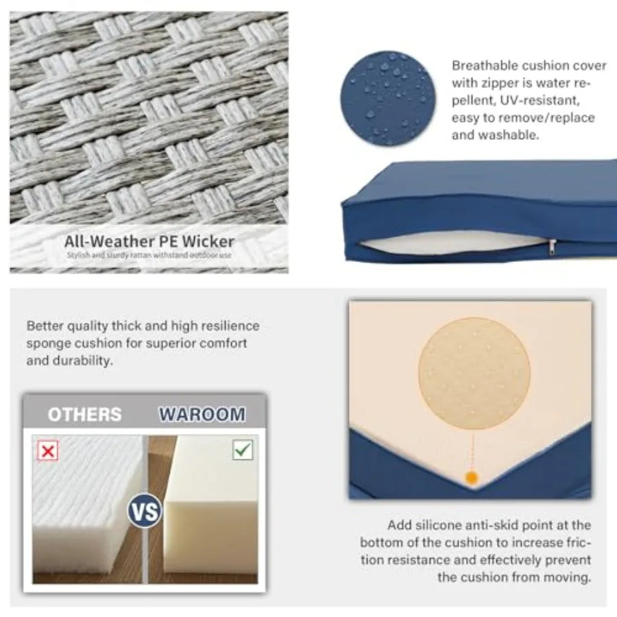 Outdoor Couch 3 Seater Wicker Patio Sofa Grey Rattan Deep Seat Balcony Furniture Porch Seating with Navy Blue Cushion