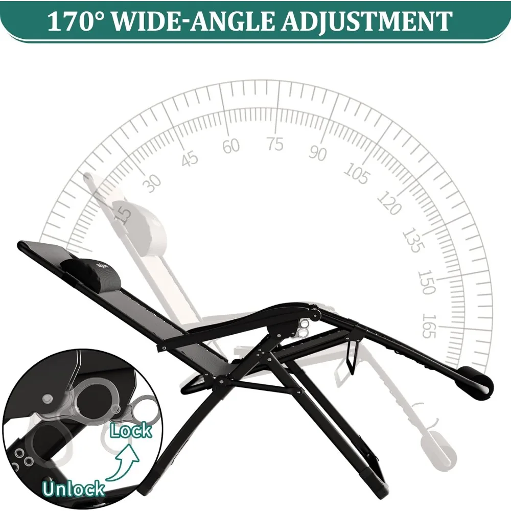 Adjustable Reclining Angle : This outdoor zero gravity lounge chair is designed with a locking system, customize your comfort with 0-170° reclining positions. Discover the perfect balance of comfort and support with our Adjustable zero gravity camping chair.