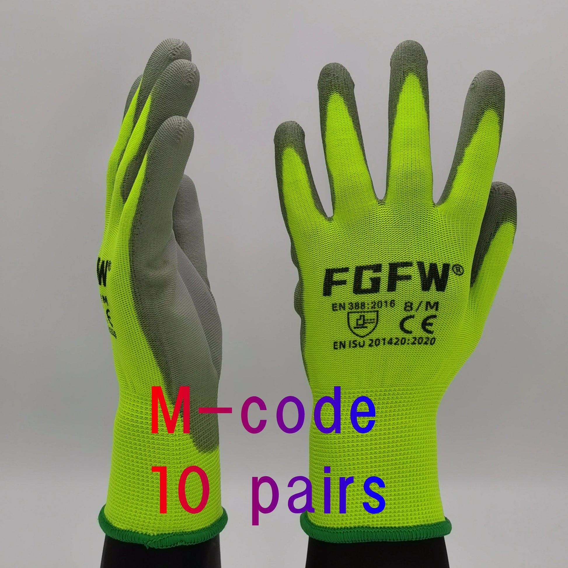 10雙PU塗佈工作手套 - 輕便耐用安全手套,通過EN 388/ISO20471認證,尺寸S/M/L/XL