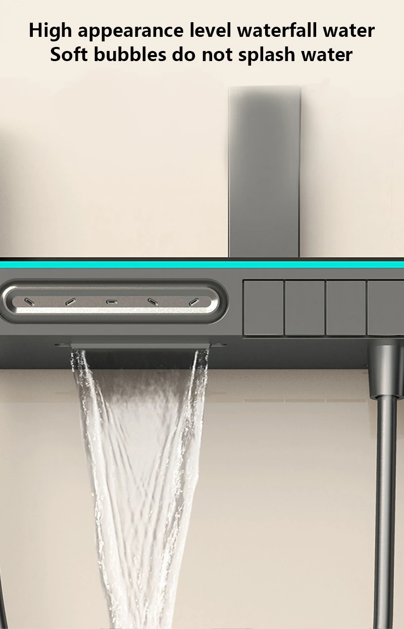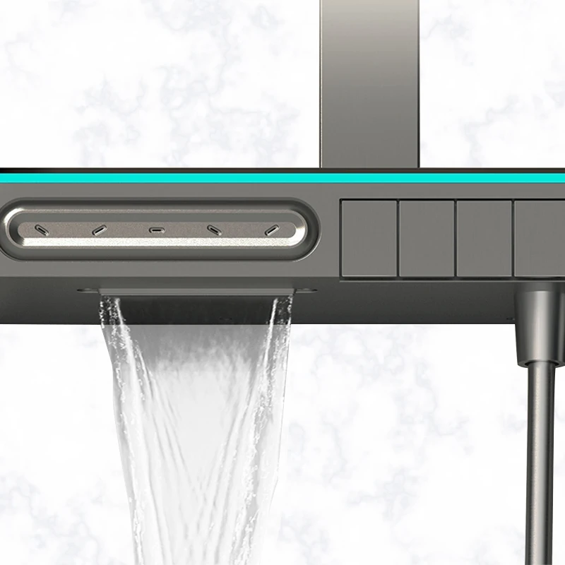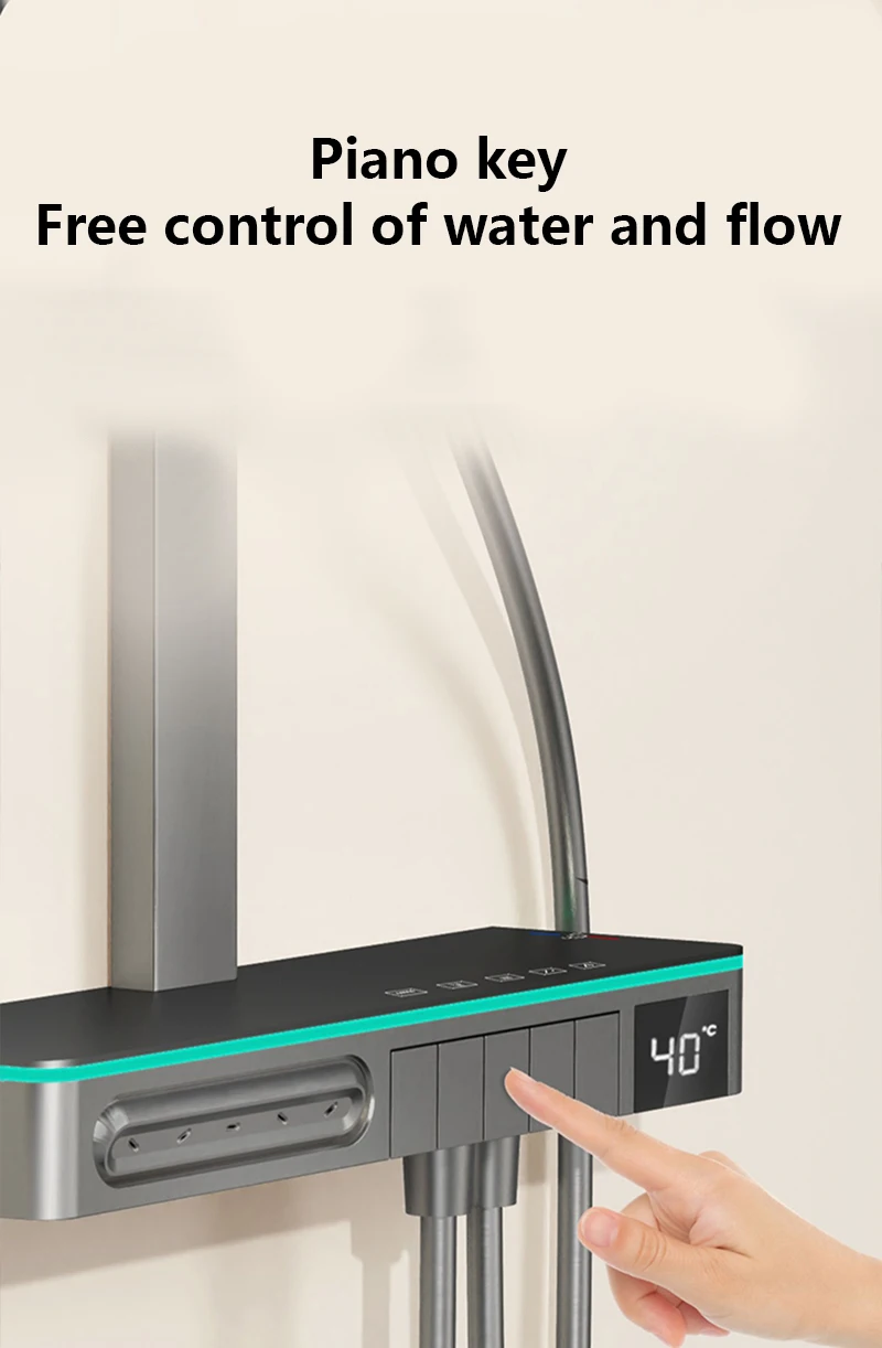 浴室多功能數位顯示淋浴系統,黃銅鋼琴鍵式外露恆溫水龍頭,柔和/雨淋式噴淋模式