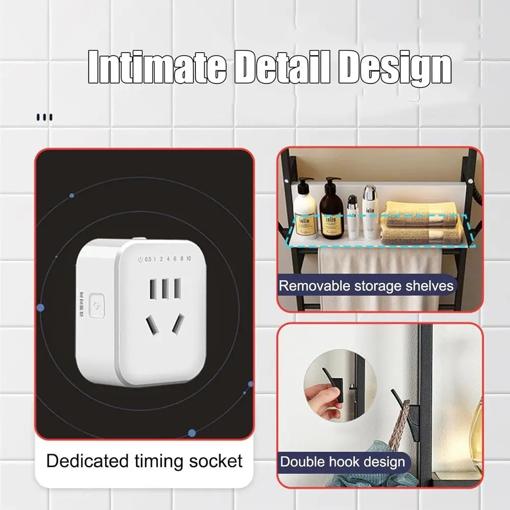 【附定時器的毛巾晾曬架】這款電熱毛巾架配備定時器,定時功能為0.5~10小時,按下定時器按鈕確認預設時間,毛巾將在您設定的時間內保持加熱狀態。