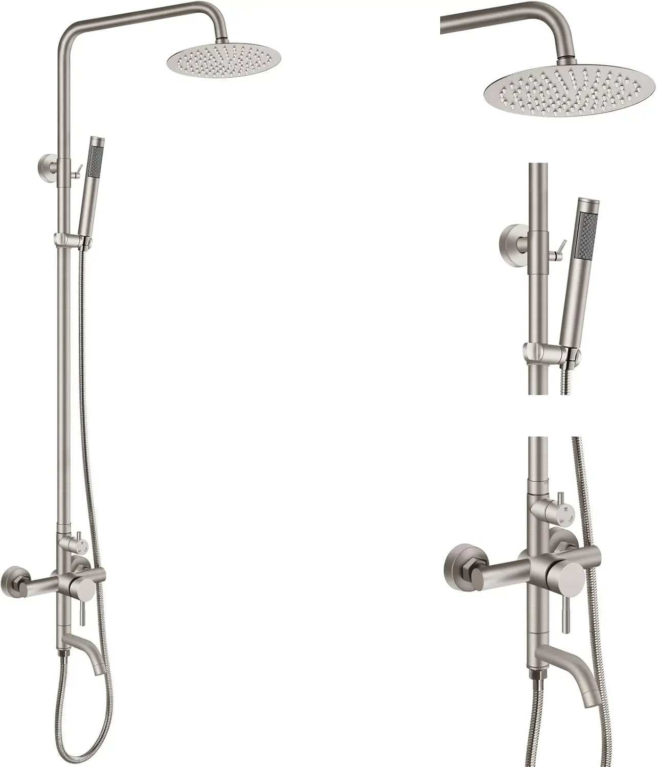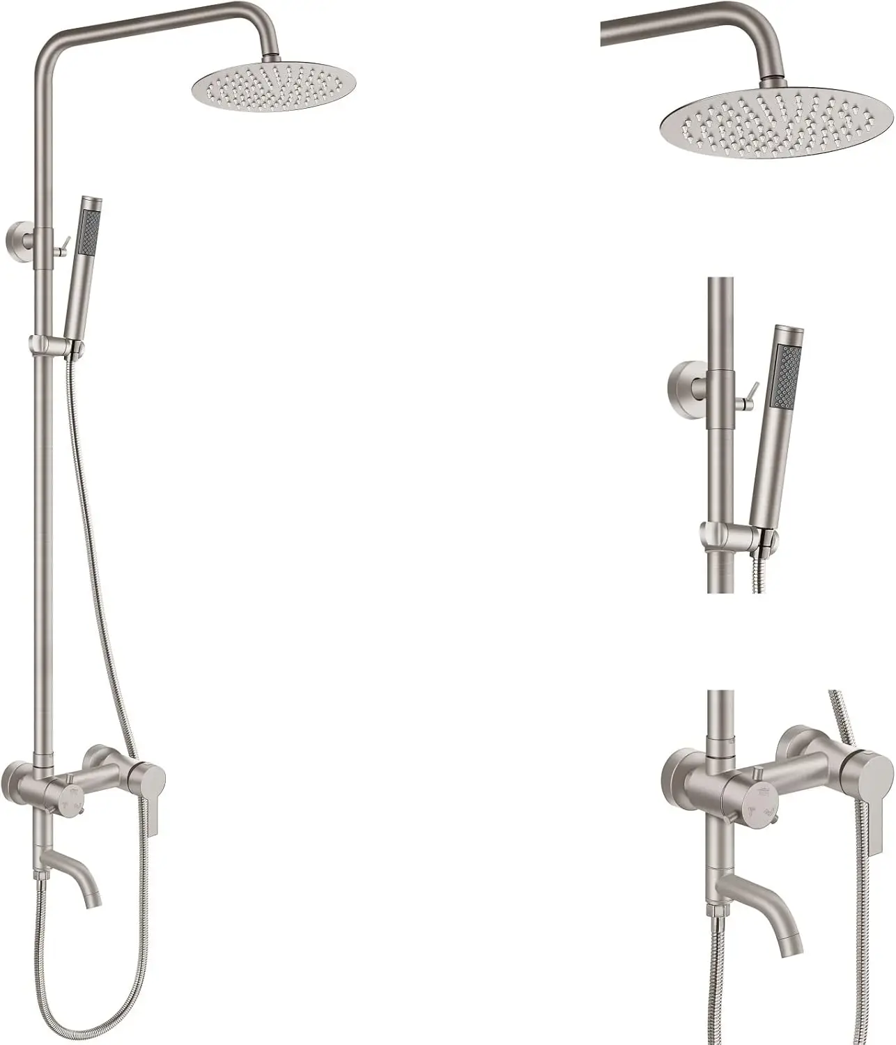 這款高級淋浴龍頭套裝專為提升您的戶外沐浴體驗而設計,兼具耐用性和多功能性。套裝採用優質SUS304不鏽鋼打造,霧面黑色表面處理,抗氧化、抗刮擦,持久亮麗不褪色。套裝包含三大實用功能:分水閥方便您在浴缸出水口、手持花灑和頂噴花灑之間輕鬆切換。可調高度讓您享受個性化的舒適體驗;主淋浴桿高度可在33.4至51英寸(85-130厘米)之間調節,手持花灑支架也可輕鬆調節,滿足您的不同需求。安裝簡便,採用壁掛式設計,只需兩個安裝孔,相容於NPT 1/2螺紋接口,並隨附所有必要的安裝配件和清晰的安裝說明,方便您快速完成安裝。這款全金屬結構的淋浴龍頭套裝性能可靠,外觀時尚,是提升浴室或戶外空間風格的理想選擇。